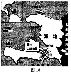 图18是海地所在地区图。加勒比海岛国海地当地时间2010年1月12日下午4点53分发生里氏7.3级强烈地震,震源深度约10公里,震中离海地首都太子港只有15公里。海地位于加勒比板块和北美板块交界处,海地地震是由于沿着加勒比海板块和北美洲板块之间的断层所引起。这次地震预计将影响300万人,海地总理在接受采访时表示,地震造成的死亡人数最终可能“超过10万人”,造成严重的人员和财产损失。地震发生后,中国国际救援队一行60余人,携带了十余吨的搜救设备和救援器械,13日20时30分从北京启程,支援海地抢险救灾。