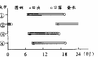 右图表示杭州、雅加达、伦敦、拉萨四城市某日日出、日落时刻北京时间)及昼长分布示意图,据此回答第33-34题。