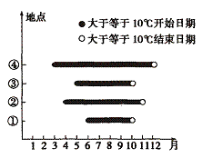 读“我国大陆东部季风区四地日平均气温≥10℃的开始日期与结束日期示意图”,回答23-24题。