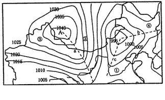 ⑵ 图中虚线(a、b、c)附近易形成暖锋的是 , c系统过境后的天气是