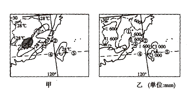 读我国东南部地区某月等温线和年降水量分布图,回答问题。(9分)