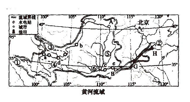(7)黄河流域的能源丰富,但不同河段的能源差异较大:上游河段以 为主;中游地区 储藏丰富,其中山西省为我国的“煤都”,其能源从该省输往京津唐地区的最主要运输方式是 ;下游沿线附近有两大油田:G ,H 。