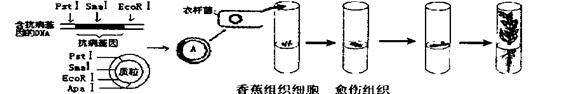 (7分)转基因抗病香蕉的培育过程如下图所示,质粒上有PstI、SmaI、EcoRI、ApaI等四种限制酶切割位点。据图回答: