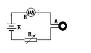 7.如图所示是用来测定高温物体温度的电阻温度计示意图。A是金属铂制成的探头(随温度的升高电阻率增大),B是灵敏电流计,E是恒定电源。若将A置入高温物体中(如炼钢炉、核反应堆等),可以通过其电阻率的变化来测定温度。则当B偏转的角度最大时,应是