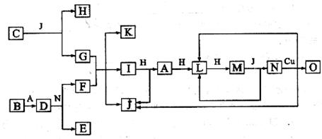 4、(10分)已知A-O分别代表一种物质,它们之间的转化关系如下图所示(反应条件略去)。A、B、H分别是由短周期元素组成的单质。B与冷水缓慢反应,与沸水迅速反应,放出氢气。D是一种离子化合物,其阴阳离子的个数比为2:3,且能与水反就应得到两种碱。C为淡黄色固体化合物,O能与G的水溶液反应生成蓝色沉淀。