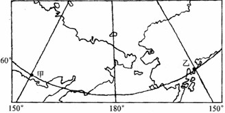 读某区域图,一架飞机在当地时间1时30分从乙地起飞时,太阳正好在地平线上。飞机朝正西飞行,到达甲地时看见太阳又在地平线附近。回答13-14题