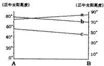 下图中的a、b、c分别表示地球上A、B两条纬线间北半球夏至日、春秋分日和冬至日时的正午太阳高度变化情况,完成20-21题。