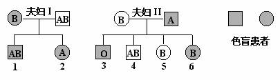 7.IA、IB和i三个等位基因控制ABO血型且位于常染色体上,色盲基因 b 位于X染色体上。请分析下面的家谱图,图中有的家长和孩子是色盲,同时也标出了血型情况。在小孩刚刚出生后,这两对夫妇因某种原因对换了一个孩子,请指出对换的孩子是: