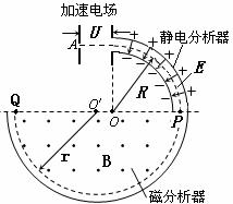 浙江省温州市十校联合体2010届高三期中联考如图所示为一种质谱仪示意图,由加速电场、静电分析器和磁分析器组成。已知:静电分析器通道的半径为R,均匀辐射电场的场强为E。磁分析器中有垂直纸面向外的匀强磁场,磁感强度为B。问:(1)为了使位于A处电量为q、质量为m的离子,从静止开始经加速电场加速后沿图中圆弧虚线通过静电分析器,加速电场的电压U应为多大?(2)离子由P点进入磁分析器后,最终打在乳胶片上的Q点,该点距入射点P多远?