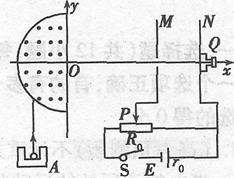 湖南师大附中2010届高三第五次月考试卷如图所示,某放射源A中均匀地向外辐射出平行于y轴的速度一定的α粒子,粒子质量为m,电荷量为q.为测定其从放射源飞出的速度大小,现让α粒子先经过一个磁感应强度为B、区域为半圆形的匀强磁场,经该磁场偏转后,它恰好能够沿x轴进入右侧的平行板电容器,并打到置于板N的荧光屏上出现亮点.当触头P从右端向左移动到滑动变阻器的中央位置时,通过显微镜头Q看到屏上的亮点恰好能消失.已知电源电动势为E,内阻为r0,滑动变阻器的总电阻R0=2 r0,求: