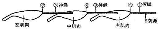 1.(10安庆师范模拟)已知肌肉受到刺激会收缩,肌肉受刺激前后肌细胞膜内外的电位变化和神经纤维的电位变化一样。取三个新鲜的神经一肌肉标本,按下图连接,图中②、④、⑥指的是神经纤维与肌细胞之间的接头,此接头与突触结构类似。刺激③可引起右肌肉收缩,中肌肉和左肌肉也随后相继收缩。现直接刺激⑤,则会引起收缩的肌肉是