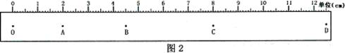 用铁架台将长木板倾斜支在水平桌面上,组成如图(1)所示装置(示意图),测量木块沿斜面下滑的加速度。所提供的仪器有长木板、木块、打点计时器(含纸带)、学生电源、米尺、铁架台及导线、开关等。图(2)是打点计时器打出的一条纸带,纸带上标注了O点和几个计数点:A、B、C、D等,相邻两个计数点间还有4个点没有标出,刻度尺的零点与O点对齐。已知打点计时器所用交流电源的频率是50Hz。