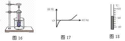 (1)图17是 (填“冰”或“蜡”)的温度随时间变化的图象。图18所示温度计显示的是蜡某时刻的温度,它的示数是 ℃。