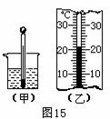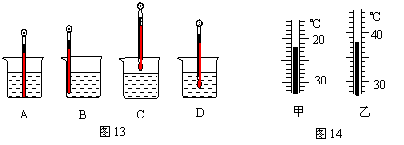 。小强在用温度计测量烧杯中液体温度时读取了四次数据,每次读数时温度计的位置如图13所示,其中正确的是 。图14中所示的是用温度计分别测得的冰和水的温度,那么冰的温度是 ℃,水的温度是