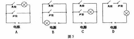 例3 : (2006年莱芜市)楼道里,夜间只是偶尔有人经过,电灯总是亮着会浪费电能。科研人员利用光敏材料制成“光控开关”,天黑时自动闭合;天亮时自动断开。利用声敏材料制成“声控开关”,当有人走动发出声音时,自动闭合;无人走动时,自动断开。若将这两个开关配合使用(如图1),就可以使楼道灯变得“智能化”,这种“智能”电路正确的是
