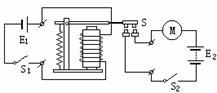 (2) 原理――如图所示,是一个利用电磁继电器来操纵电动机的电路。其中电源E1、电磁铁线圈、开关S1组成的控制电路;而电源E2、电动机M、开关S2和触点、开关S组成工作电路。当S1闭合时,电磁铁线圈中有电流通过,电磁铁将衔铁吸下,触点开关接通,电动机便转动起来;当断开S1时,电磁铁中失去电流,电磁铁失去磁性,弹簧使衔铁上升,触点开关断开,电动机停止运转。