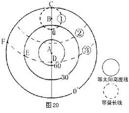 26、图20为“北京时间16点、太阳直射A点时的光照图”,A点的是纬度20°N。读图回答下列问题。(8分)