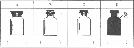 (2)实验室里化学试剂的保存方法是不相同的,下图中A、B、C、D是常见的一些保存药品的试剂瓶。请把下列常见试剂的序号填写在应要保存的各试剂瓶下面的括号内:①浓硫酸②碳酸钠溶液③大理石④酒精⑤氯水⑥浓硝酸![]()