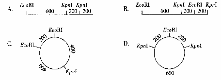 3. 现有一长度为1000碱基对(bp)的DNA分子,用限制性核酸内切酶KpnI酶切后得到的DNA分子仍是1000bp,用EcoRI单独酶切得到200bp和800bp两种长度的DNA分子,用EcoRI、KpnI同时酶切后得到200 bp和400 bp两种长度的DNA分子。该DNA分子的酶切图谱正确的是