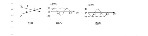 19.如图甲所示,两列横波沿同一水平面上传播,两列横波的波源沿竖直方向振动。横波1的波源B点的振动图象如图乙所示;横波2的波源C点的振动图象如图丙所示。两列波的波速都为20 cm/s。两列波在P点相遇,P与B、C两点的距离均为40 cm,则P点振幅为D
