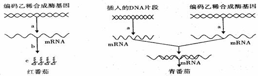 (1)图中的a、b在遗传学上分别称为 和 。图中的c应当是基因控制合成的 ,在右图转基因番茄中不能合成c,是因为它的模板mRNA成为 ,因而不能与 相结合。