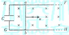 18.如图所示,EF、GH为平行的光滑金属导轨,匀强磁场垂直于导轨平面,C为电容器,ab为可在EF和GH上滑动的导体横杆,正以速度v匀速向右运动. 若突然使电容器两板错开使其正对面积减小些,则 ( )