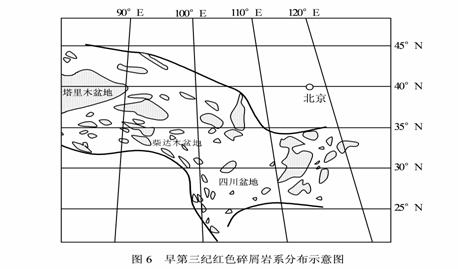 早第三纪,中国副热带地区气候干燥,形成沿纬向分布的红色碎屑岩系。由于印度板块向北的漂移与挤压,青藏高原隆起,改变了区域大气环流格局。读图6,完成8~9题。