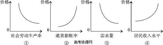 9.下列示意图反映的是通常情况下价格与相关因素的关系。其中①②④分别反映的是价格随社会劳动生产率、通货膨胀率、居民收入水平变化的曲线,③反映的是需求量随价格变化的曲线。这些示意图中正确反映价格与相关因素关系的是