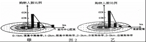 下图表示某大城市居民10年前和现在购物空间变化示意图(图2),读图回答3-4题。![]()