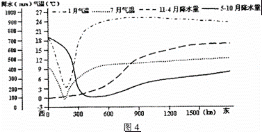 下图为某大陆沿纬线气温和降水变化曲线图(图4),读图回答7~8题。