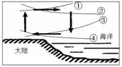 图中箭头表示气流状态,①②③④表示等压线,读图回答15-16题。
