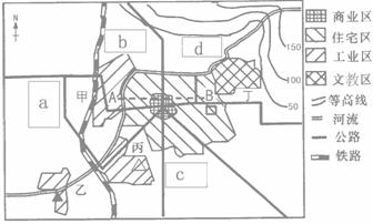 下图为某城市功能分区示意图,图中字母代表功能区,该城区有一条河流穿过。据此回答26-27题。