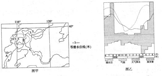 36.(26分)下图中图甲是我国华北地区某区域年平均等潜水位线图,图乙是图甲中B地区(椭圆区域)潜水位与气候要素变化关系图。读图回答问题。