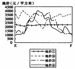 (2)某房地产商欲开发图16中EF沿线房地产,预先调查了沿线地价,图15中正确反映EF沿线地价变化的曲线是(选择填空)