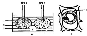 (1)一个成熟的植物细胞可看作一个封闭的渗透系统,因为图B中的____________结构相当于图A中的2(半透膜),细胞中的___________相当于图A中的a溶液,4处的物质为_____________,这种物质能到达4处是因为_________________。从细胞结构的角度来分析,图B中的细胞发生质壁分离的原因是 ______ 。