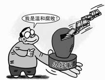 40.漫画:“温和腐败”2009年8月4日《检察日报》:云南省麻栗坡县委原书记赵仕永说:“那些不给钱就不办事的人是‘暴力腐败’;像我这样,在为人办好事的情况下收点钱,是温和的,所以我说自己是一个温和腐败的县委书记。”由此可见,我国制度反腐、事前监督任重道远。在我国加强制度反腐、事前监督有利于