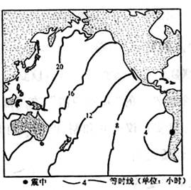 1.2010年2月27日凌晨1时34分(当地区时),智利中部近岸(72.6°W,36.1°S)发生里氏8.8级地震。下图显示了地震引发的海啸波在大洋中前进的等时线分布状况。海啸波到达我国沿海地区时,北京时间可能为