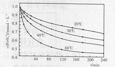 (2)高铁酸钾溶于水能释放大量的原子氧,从而非常有效地杀灭水中的病菌和病毒,与此同时,自身被还原成新生态的Fe(OH)3,这是一种品质优良的无机絮凝剂,能高效地除去水中的微细悬浮物。将适量K2Fe2O4溶液于pH=4.74的溶液中,配制成c(FeO2-4)=1.0mmol·L-1试样,将试样分别置于20℃、30℃、40℃和60℃的恒温水浴中,测定c(FeO+2-4)的变化,结果见下图。高铁酸钾与水反应的离子反应方程式为 ,该反应的△H 0(填“>”“<”或“=”)。