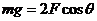 解析:熟练应用力的合成和分解以及合成与分解中的一些规律,是解决本题的根本;一个大小方向确定的力分解为两个等大的力时,合力在分力的角平分线上,且两分力的夹角越大,分力越大。题中当绳子拉力达到F=10N的时候,绳子间的张角最大,即两个挂钉间的距离最大;画框受到重力和绳子的拉力,三个力为共点力,受力如图。绳子与竖直方向的夹角为θ,绳子长为L0=1m,则有