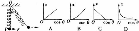 11.(06山东潍坊高三期中)如图所示,一根轻弹簧上端固定在O点,下端拴一个钢球P,球处于静止状态.现对球施加一个方向水平向右的外力F,使球缓慢偏移,在移动中的每一个时刻,都可以认为钢球处于平衡状态,若外力F的方向始终水平,移动中弹簧与竖直方向的夹角θ < 90°,且弹簧的伸长量不超过其弹性限度,则下图给出的弹簧伸长量x与cosθ的函数关系图象中,最接近实际的是 ( )