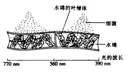 3.(8分)把载有新鲜水绵和细菌的临时装片,置于显微镜载物台上观察。光线从反光镜反射上来后,可看到细菌从分散状态逐渐向水绵方向运动,水绵附近细菌的密度增加。如果在反光镜上方放置一个三棱镜,使七种不同颜色的光束照射水绵的不同部位,这时看到细菌逐渐聚集成明显的两堆(如图所示)。