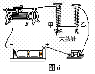 小胖将漆包线(表面涂有绝缘漆的铜线)绕在两个完全相同的铁钉上,制成了简易电磁铁甲和乙,来探究“影响电磁铁磁性强弱的因素”如图6所示。 ⑴实验时通过观察___,可以判断电磁铁的磁性强弱不同; ⑵电磁铁乙的铁钉帽端为___极(填“N”或“S”); ⑶分析实验可知,电磁铁甲、乙磁性强弱不同的原因是_________________。