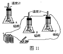 ⑶(2分)如图11所示,在完成探究“通电导体产生的热量与导体电阻的关系”后,在原来电路的基础上,请你将A烧瓶中锰铜合金丝接入电路,使该电路能用来探究“通电导体产生的热量与电流的大小的关系”这一问题。