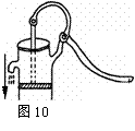 ⑵(3分)如图10是一个简易压水泵,整个手柄是一个弯曲的杠杆。图中箭头表示此时活塞的运动方向。请在图上标出支点O,画出作用在手柄上的最小动力F1,并作出的力臂L1。