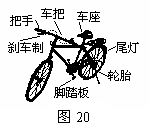 21、(每小题2分,共8分)自行车是中国老百姓最常用的交通工具。如图20所示,从自行车的结构和使用来看,它涉及了许多物理知识。请你填写下表中的“应用举例”和“物理原理”。