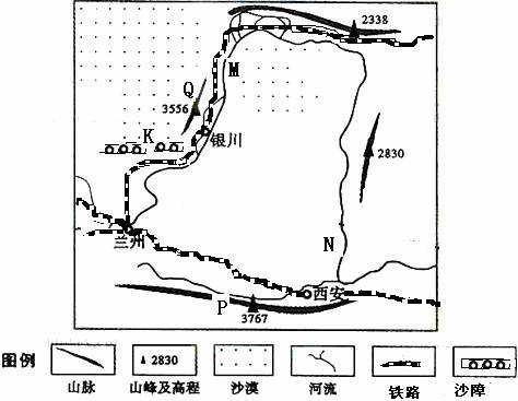 (1)图中沙障(K处)保护的铁路线是___ ____铁路 ,阻隔的沙漠名称是___ ____ 。(4分)