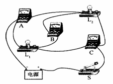 6(09绍兴)如图所示电路,A、B、C是电流表或电压表,单位是安或伏,闭合开关S,A、B、C三表的示数分别为0.5、1、1.5时,灯L1、L2恰好正常发光,已知灯L1、L2的额定功率之比为3∶1。下列说法正确的是( )