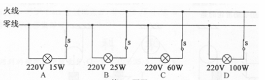 14(09温州)闭合开关后,下图中的四个灯泡都正常发光,其中最亮的是D