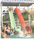 如图所示,水上滑梯由斜槽AB和水平槽BC构成,AB与BC圆滑连接,斜槽AB的竖直高度H=15m,BC面高出水面的距离h=0.80m。一个质量m=50kg的游戏者从滑梯顶端A点由静止滑下,g取10m/s2。
