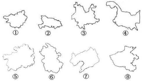 下面我国八个省级行政区的轮廓图,其中简称为黔和省会在合肥的分别是: ( )